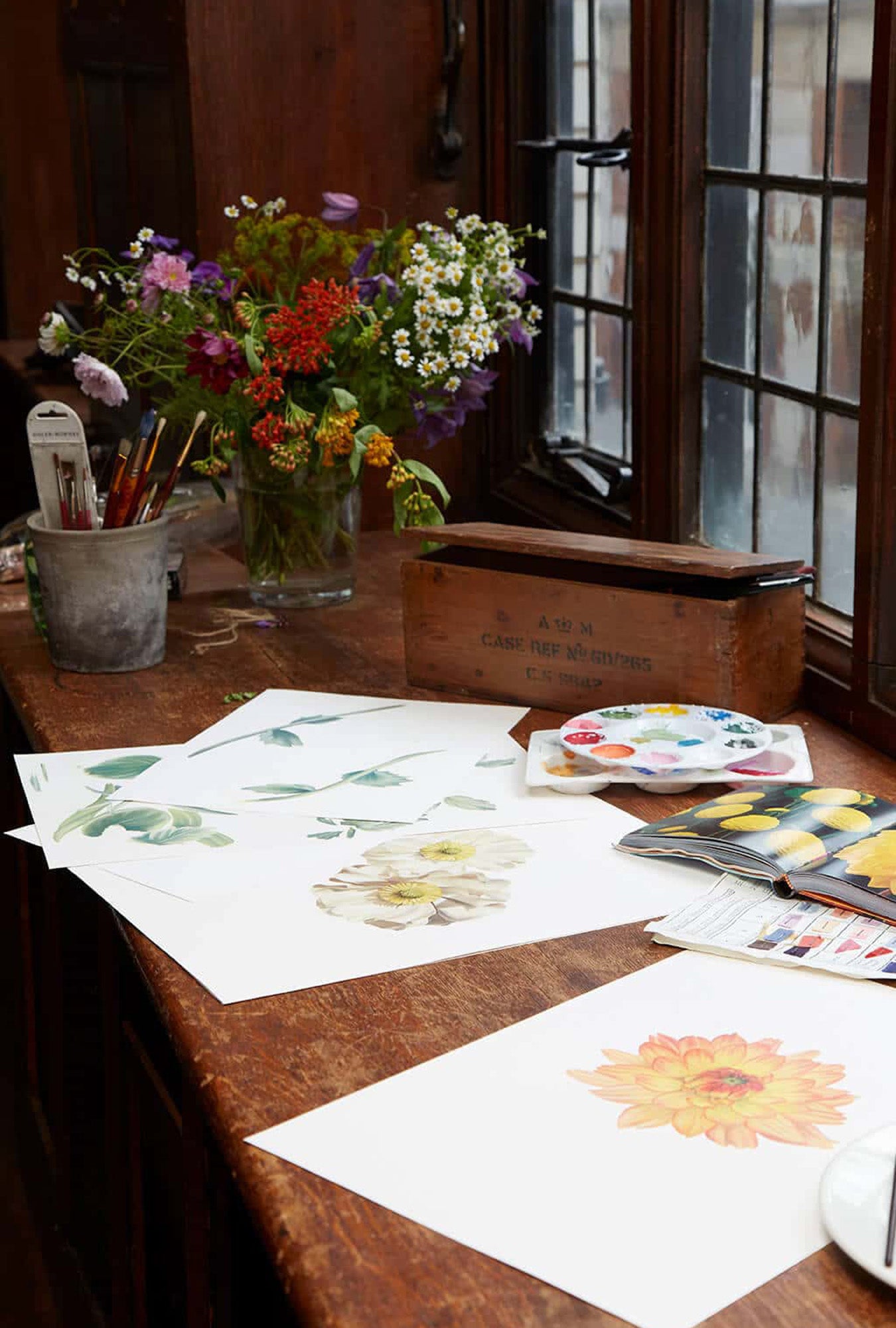 Hand-painted designs in the studio.